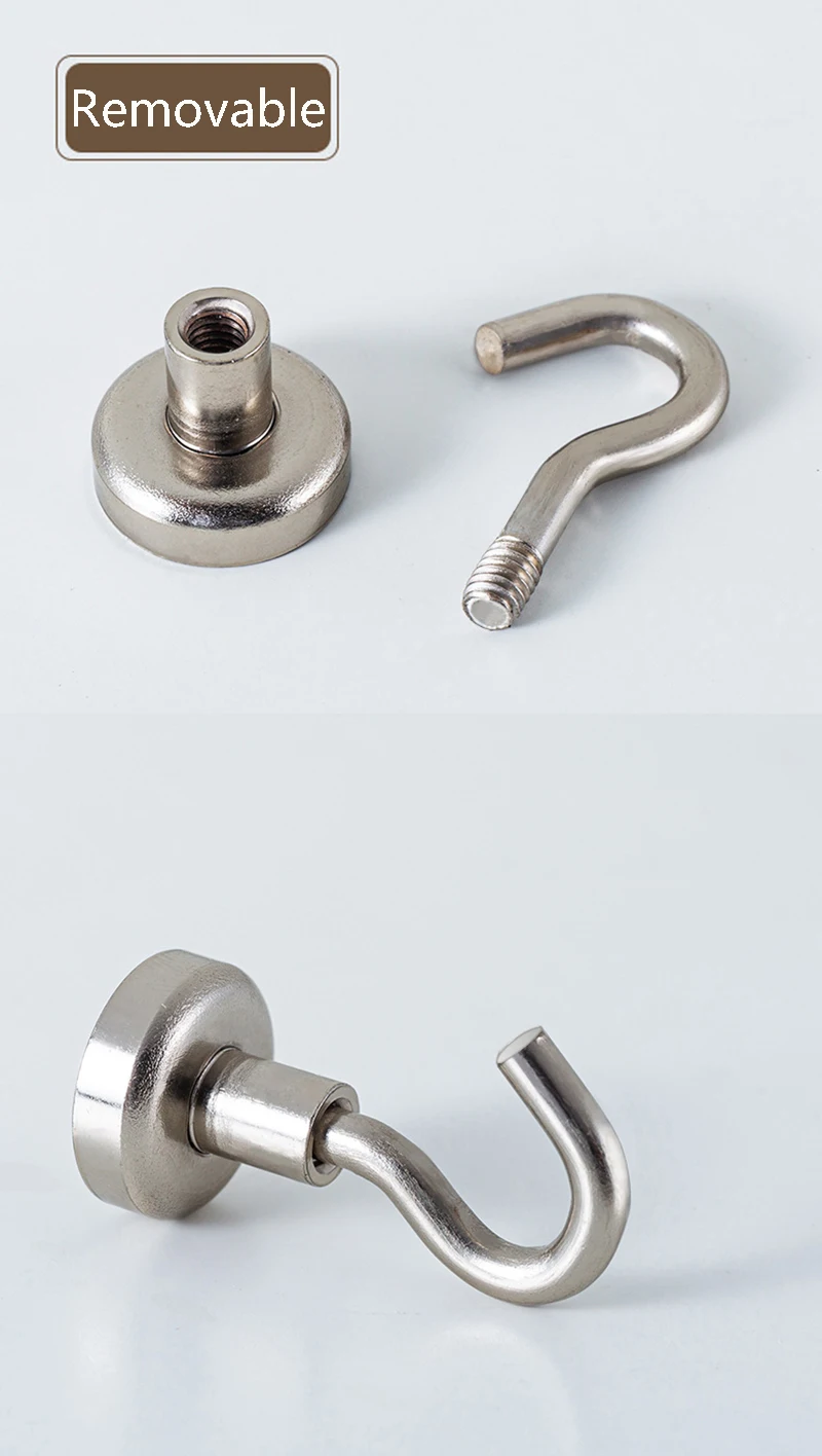 Feature: 1. MULTI PURPOSE: Perfect use for hang little gadgets, magnetic hooks usually used for hang hats, keys, towels 2. HIGH QUALITY: The powerful magnetic force is only concentrated at the bottom, The other three sides are Protected by steel cups that almost no magnetic force and magnetic force equivalent to 10 times the volume of the same magnet. force permanent, long service life. 3. BEST COATING: Ni+Cu+Ni Triple Layer Coated. The Best Coating Available, which Provides a Shiny and Rust Resistant Coated steel cup provides protection for the magnet and helps to prevent chipping or cracking.